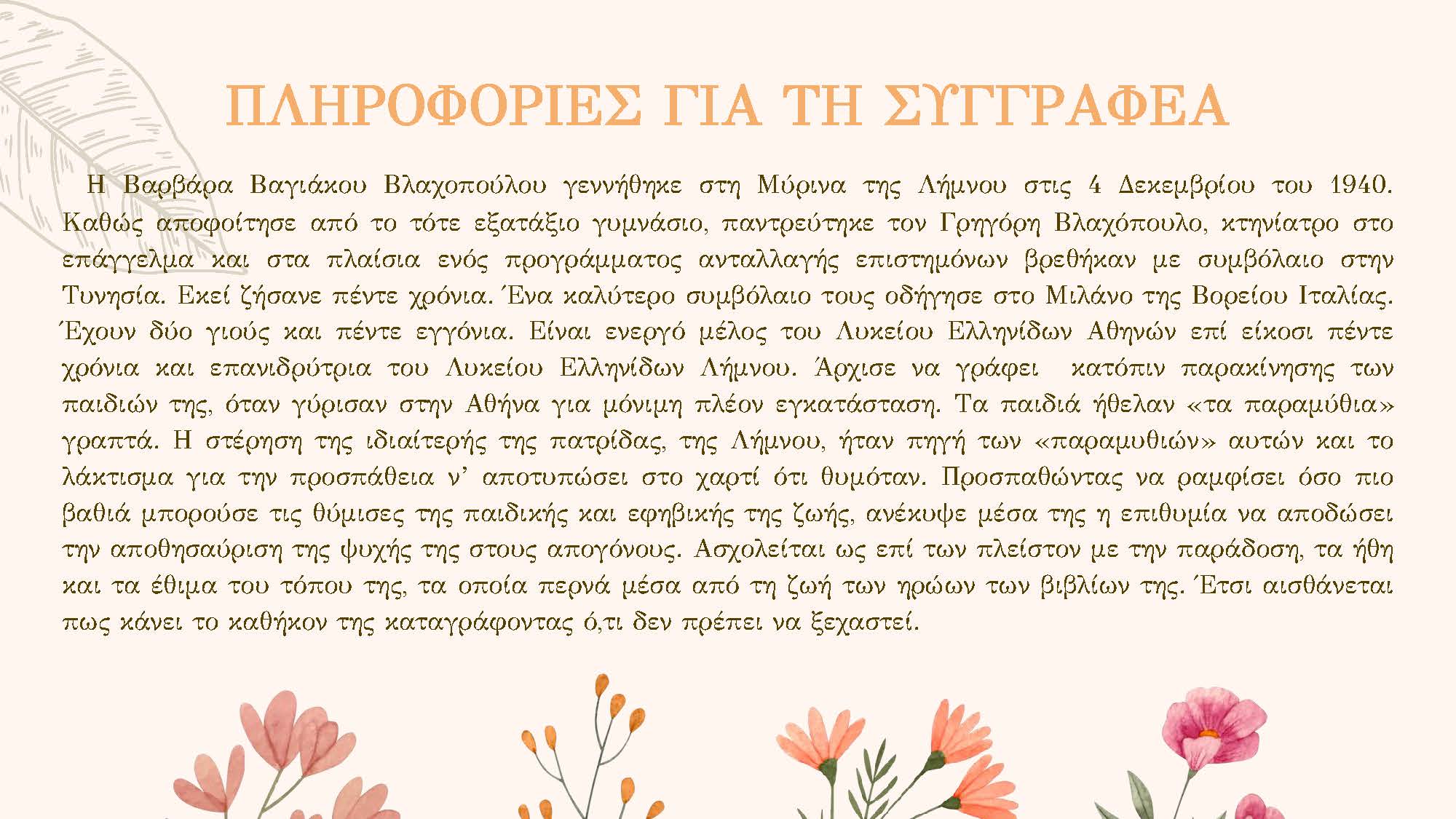 • ΠΑΡΟΥΣΙΑΣΗ ΤΟΥ ΒΙΒΛΙΟΥ ΤΗΣ ΒΑΡΒΑΡΑΣ ΒΑΓΙΑΚΟΥ – ΒΛΑΧΟΠΟΥΛΟΥ «ΤΙ ΑΡΩΜΑ ΦΟΡΑΣ, ΓΙΑΓΙΑ;»