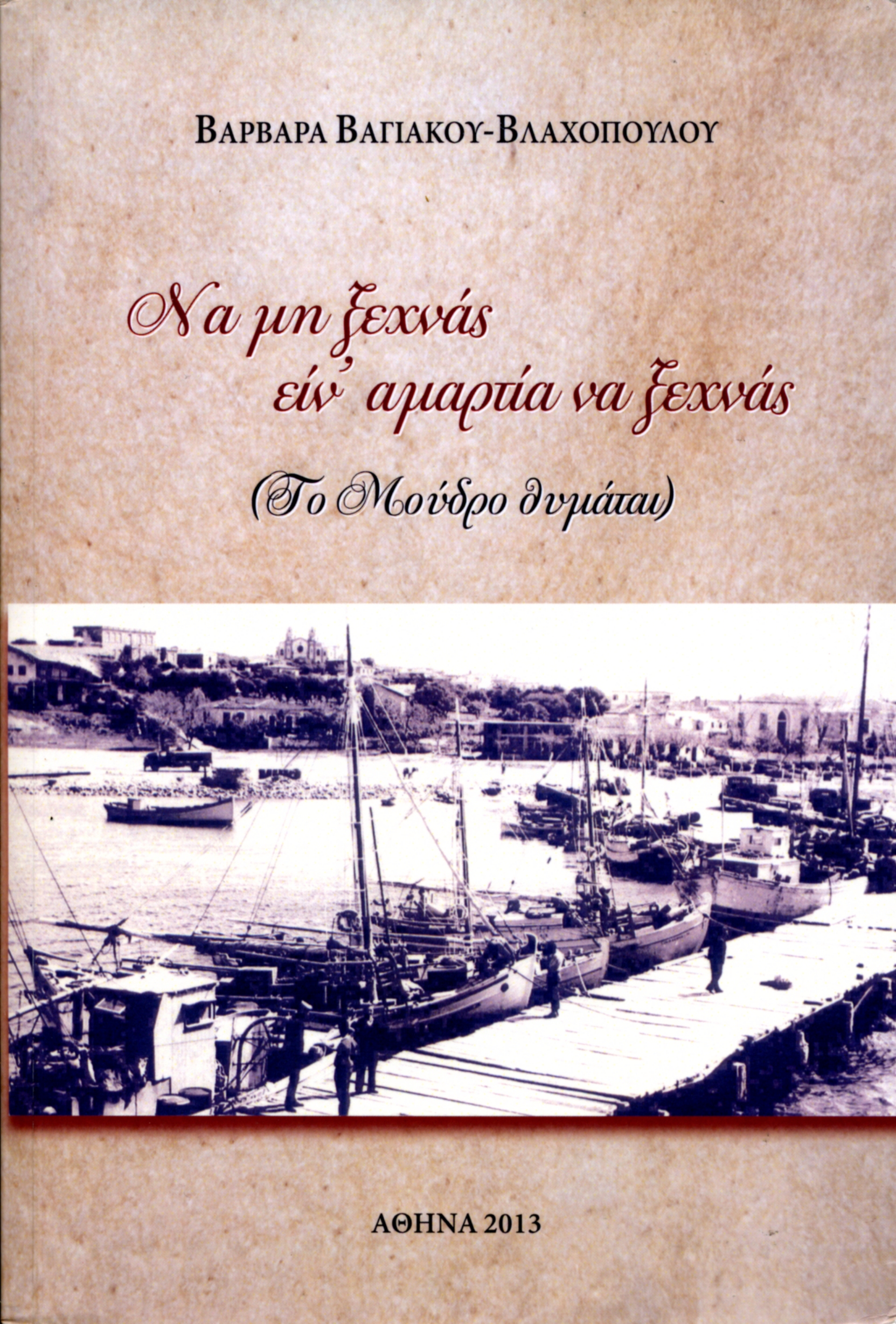 ΝΑ ΜΗ ΞΕΧΝΑΣ, ΕΙΝ' ΑΜΑΡΤΙΑ ΝΑ ΞΕΧΝΑΣ (ΤΟ ΜΟΥΔΡΟ ΘΥΜΑΤΑΙ) Έκδοση: Λύχνος, 2013 Το βιβλίο παρουσιάστηκε στο κοινό της Λήμνου από τον ιστορικό του νησιού κύριο Θεόδωρο Μπελίτσο, ο οποίος έχει γράψει και την εισαγωγή, και απο τον ιατρό, συγγραφέα και ποιητή Σταύρο Τραγάρα. Αποσπάσματα διάβασε η συμβολαιογράφος Τριανταφυλλιά Παλαιογιάννη. |